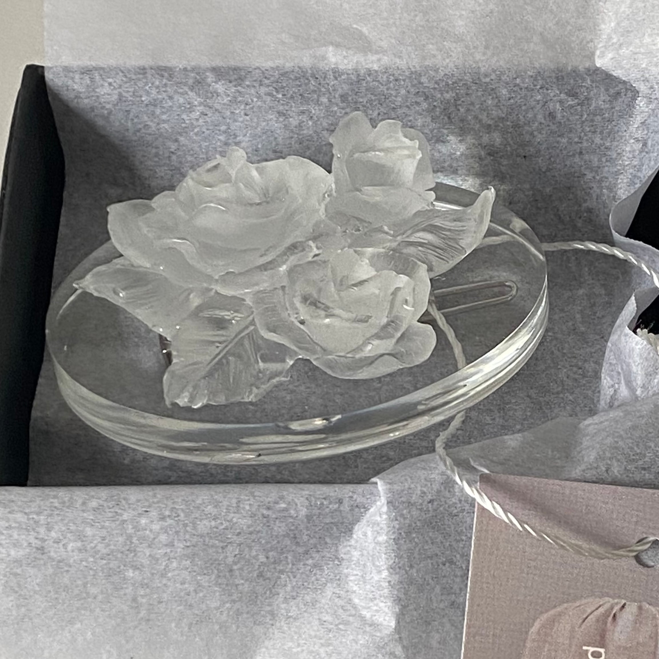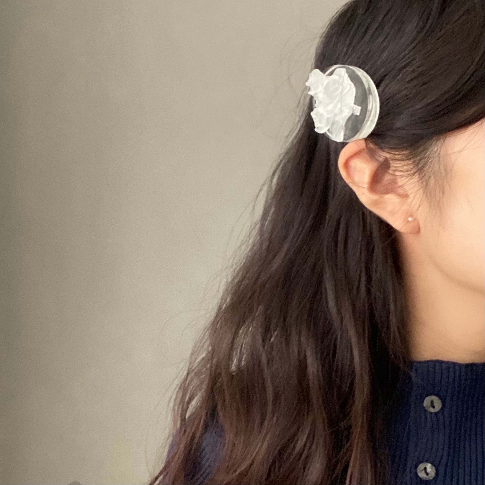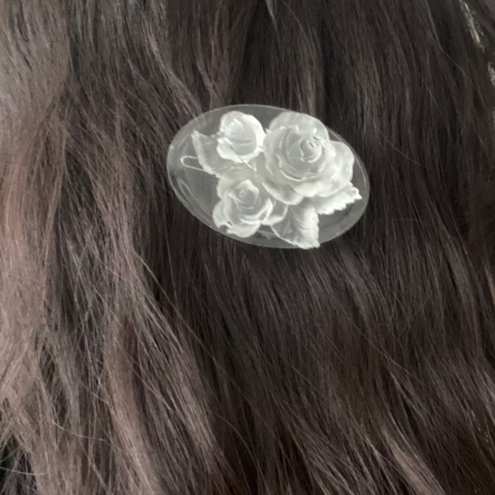 氷のようなバラを丸みが美しい楕円に乗せたヘアピンです。