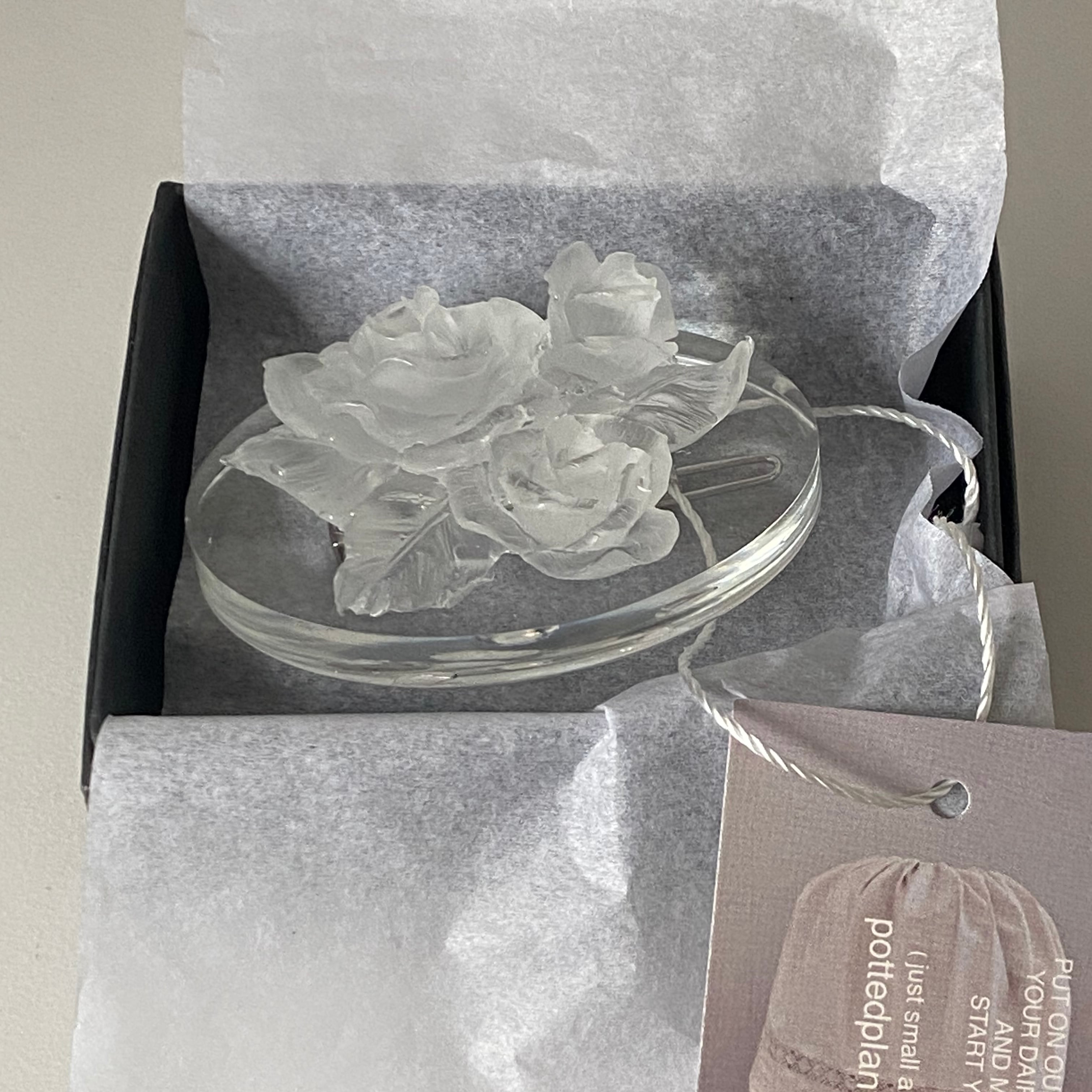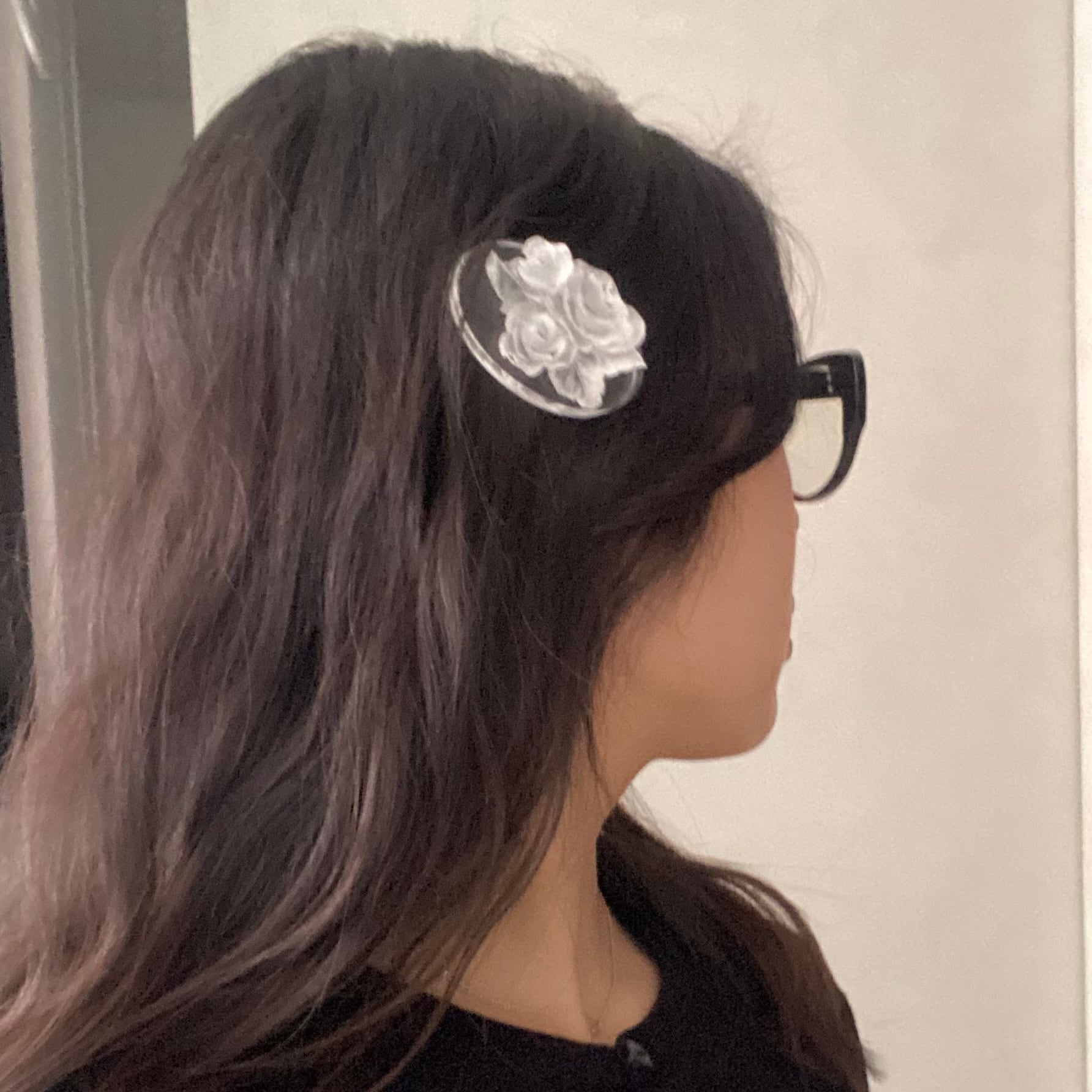 氷のようなバラを丸みが美しい楕円に乗せたヘアピンです。