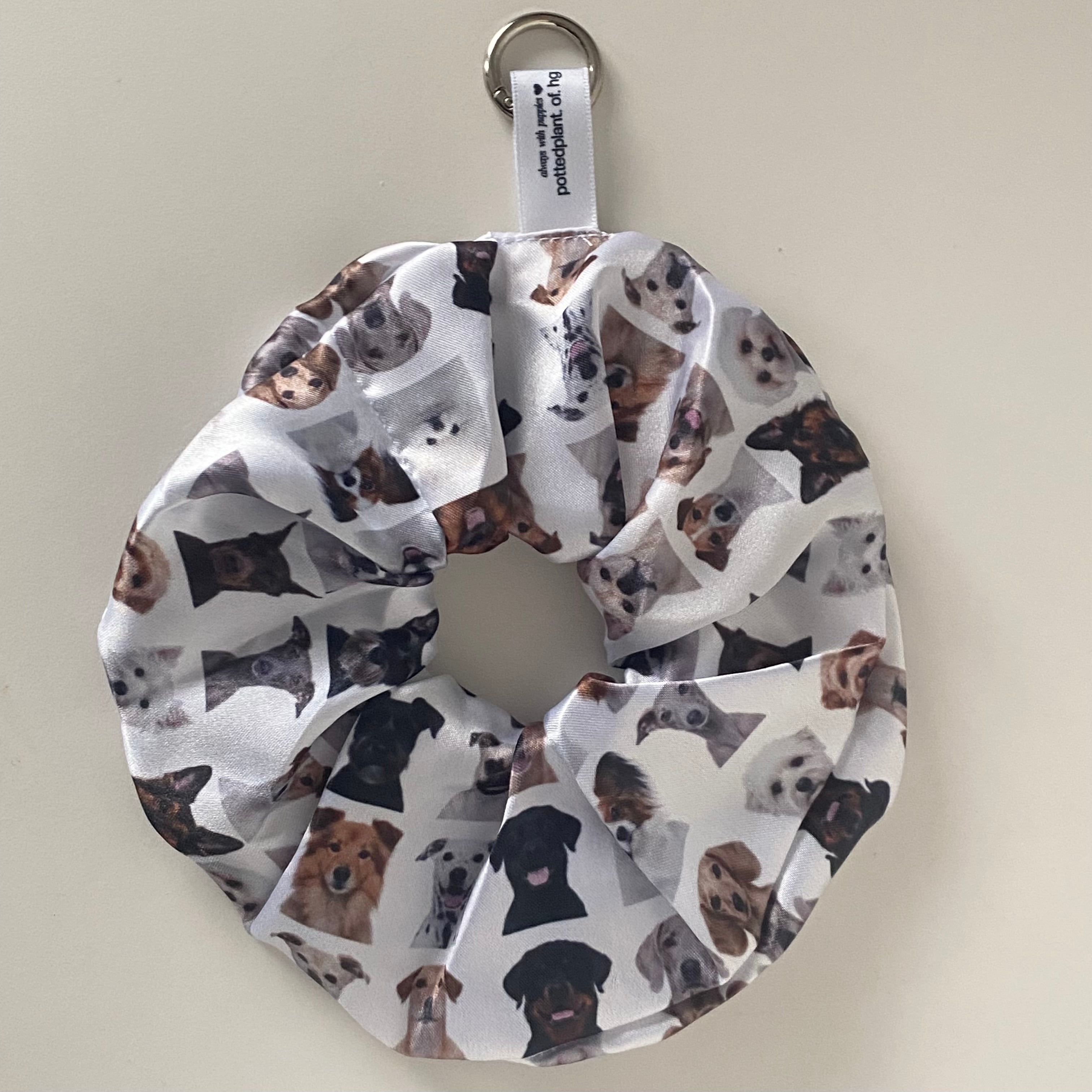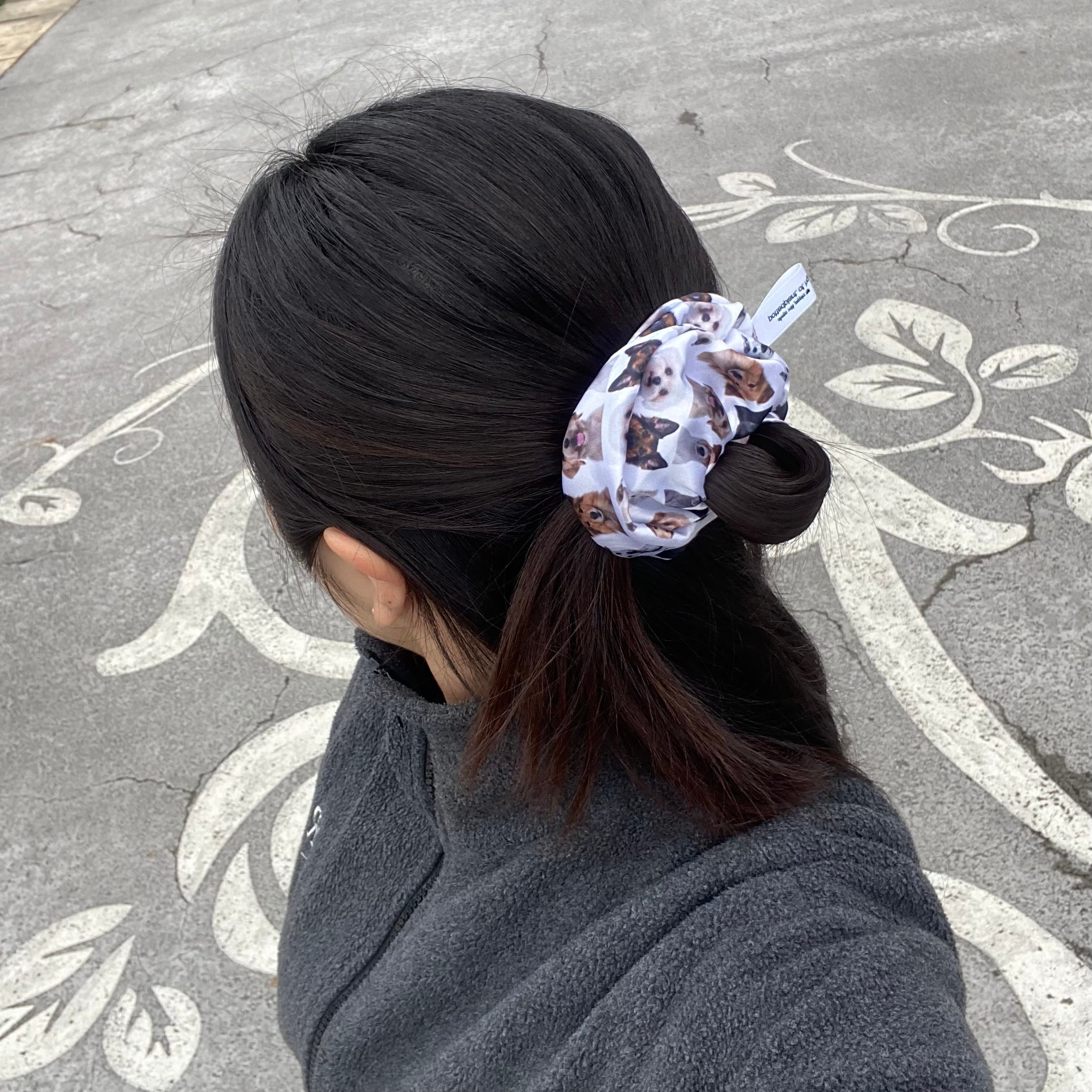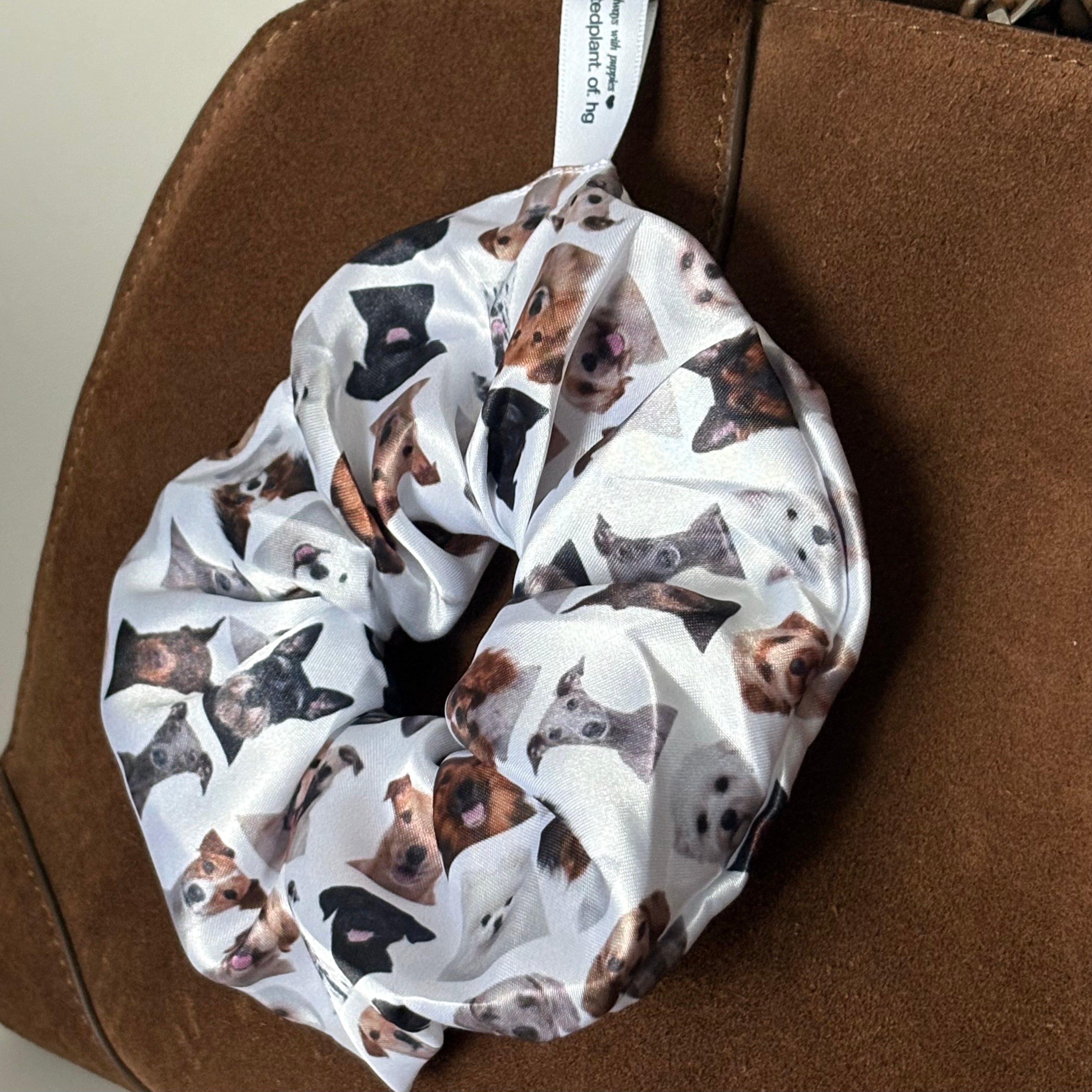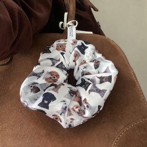 犬の証明写真がたくさん散りばめられたサテンシュシュ。