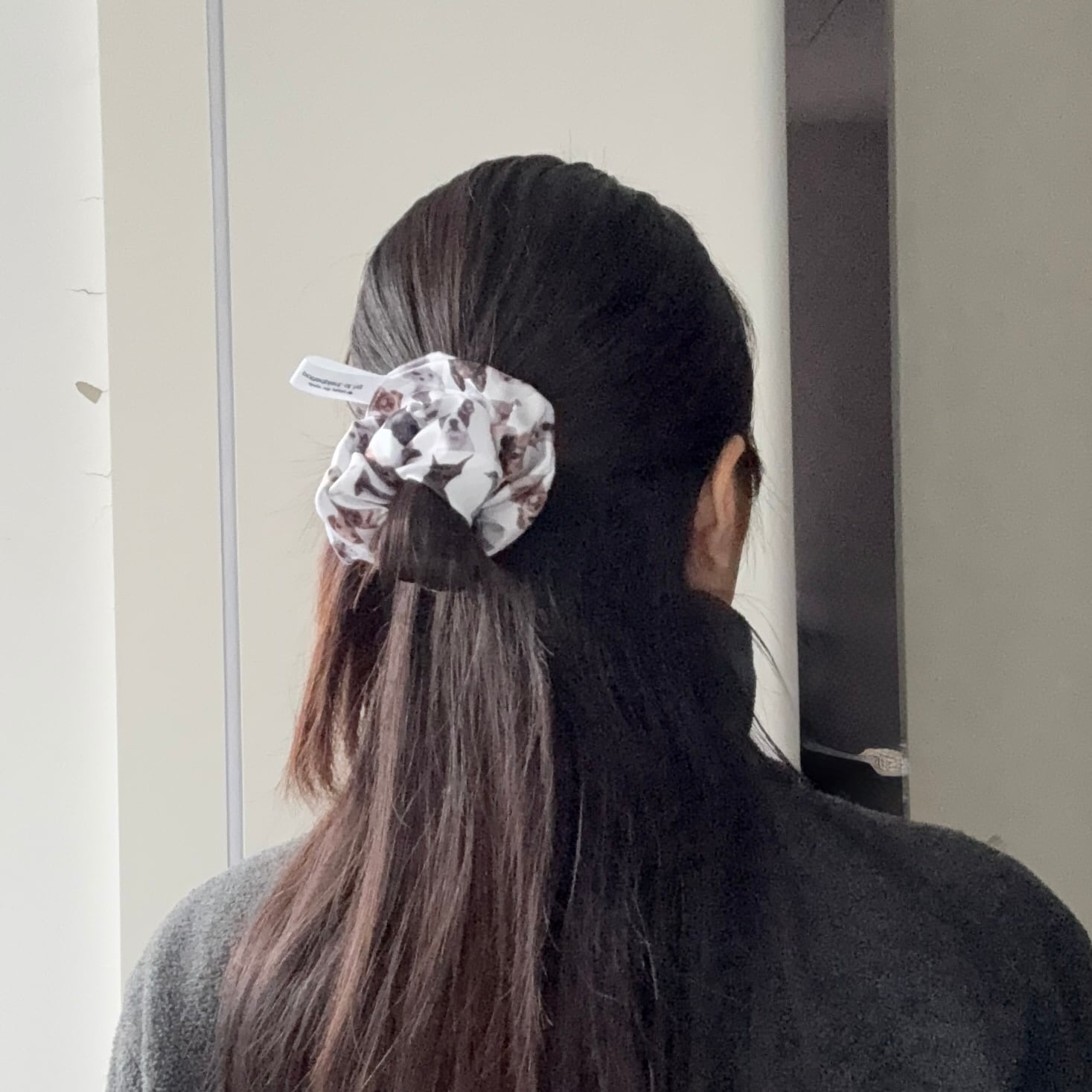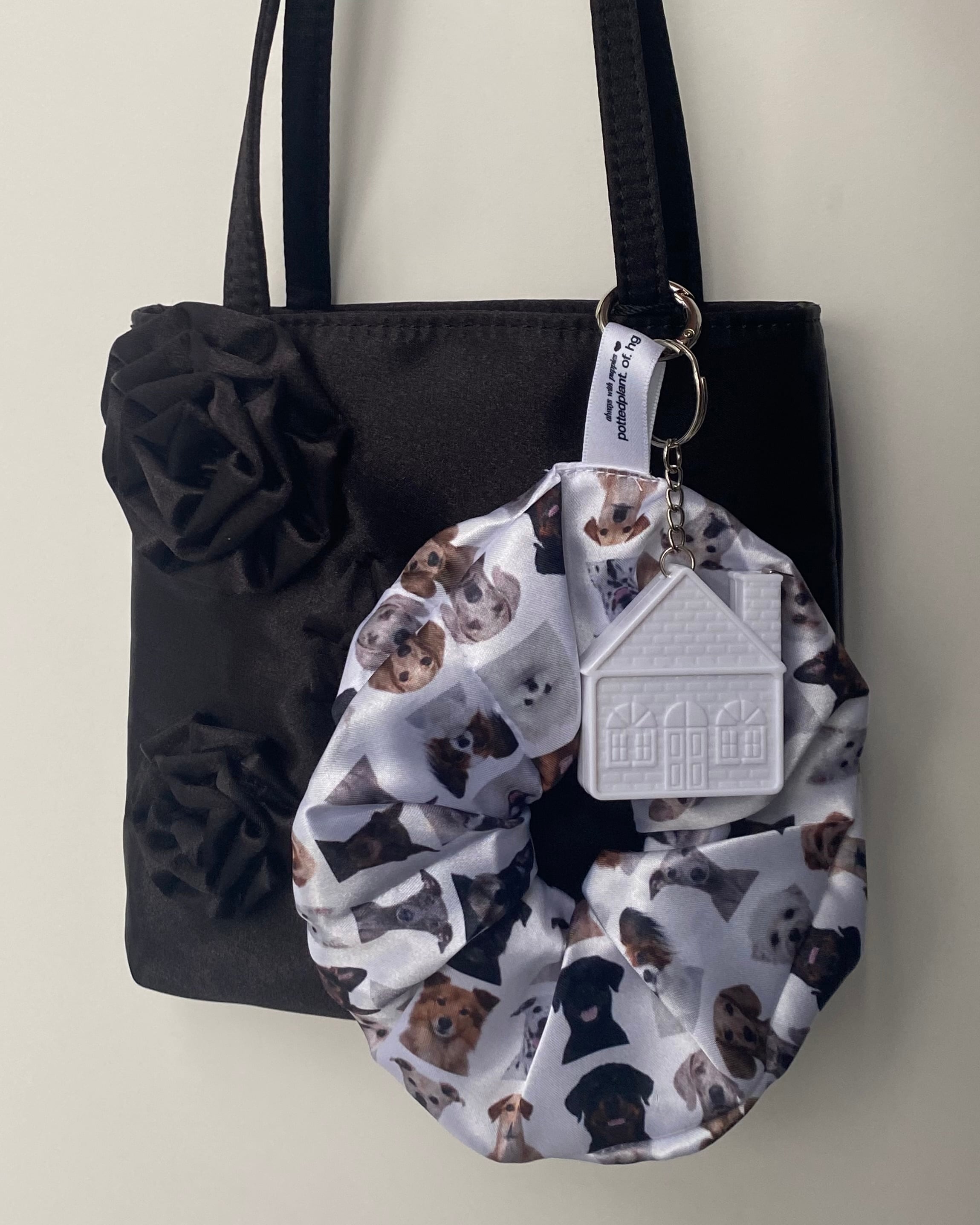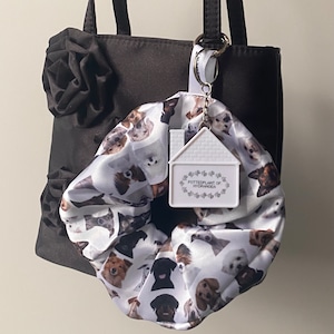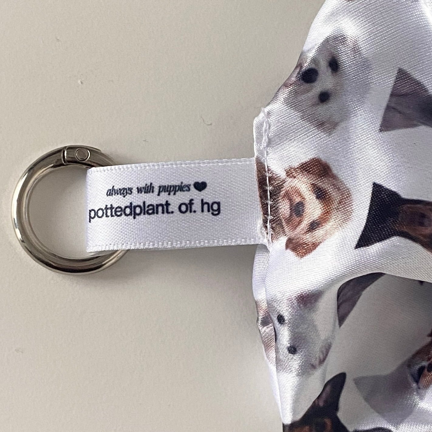 犬の証明写真がたくさん散りばめられたサテンシュシュ。